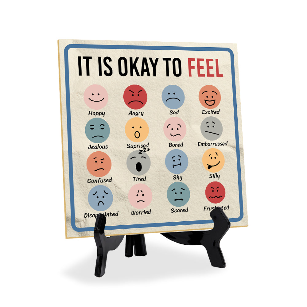 It Is Okay To Feel, 5x5 Square Table Sign. This table sign comes with it's own black acrylic easel, easy to set up and display on any flat surface.
