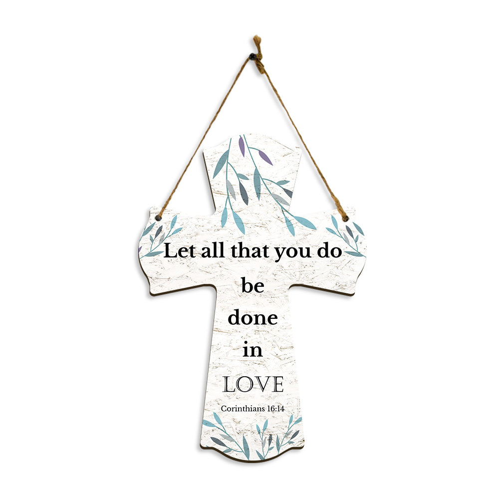 Introduce faith and elegance to any space with our Let all that you do be done in love. Corinthians 16:14 11.5 x 8.5-inch hanging cross sign. Crafted from wood and hung by a piece of rustic twine, this simple and stylish design suits any space. Each cross is meticulously designed by our dedicated team, featuring carefully chosen messages of worship, scripture extracts, and heartfelt dedications of faith, making it a meaningful addition to any room. Whether displayed in your home, office, or place of worship, this hanging cross sign serves as a constant reminder of faith and inspiration. It's perfect for gifting on special occasions such as baptisms, birthdays, and weddings, or as a thoughtful way to celebrate and express your faith daily. Our hanging cross signs are not just decorations; they are symbols of devotion and cherished keepsakes that bring spiritual warmth and a sense of devotion into any environment. Celebrate and share your beliefs with this elegant and inspiring hanging Cross sign, a testament to your faith and a beautiful addition to any space.