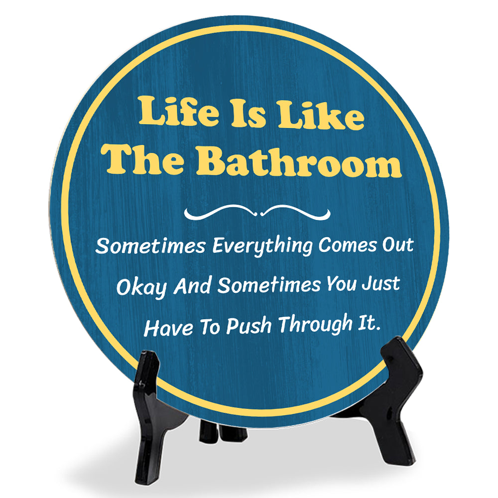 Life Is Like The Bathroom Sometimes Everything Comes Out Okay And Sometimes You Just Have To Push Through It. (5 x 5“) Circle Table Sign with Acrylic Stand | Funny Home Decor