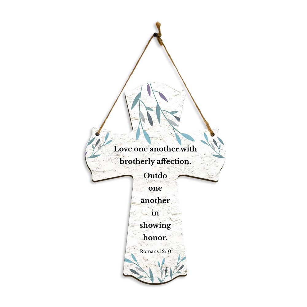 Love one another with brotherly affection. Outdo one another in showing honor. Romans 12:10 11.5" x 8" Cross Hanging Sign | Rustic Twine | Inspiring Religious Bible Decor