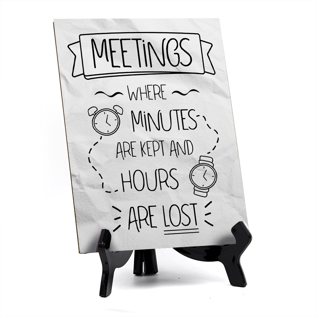 Meetings Where Minutes Are Kept And Hours Are Lost, 6X8 Table Sign. This table sign comes with it's own black acrylic easel, easy to set up and display on any flat surface. Brighten up your workspace with our Inspirational Funny Table sign. This delightful 6 x 8" sign is designed to add a touch of humor and motivation to any office or workplace environment. Made with high-quality materials and featuring a sleek black easel stand, this sign is both durable and stylish. Whether you place it on your desk, shelf, or any flat surface, it's sure to catch the eye and spark conversation. Inject some positivity into your day with our collection of witty and inspiring quotes that are sure to lift your spirits and bring a smile to your face. Perfect for yourself or as a gift for coworkers, friends, or family members, this table sign is a charming addition to any workspace.