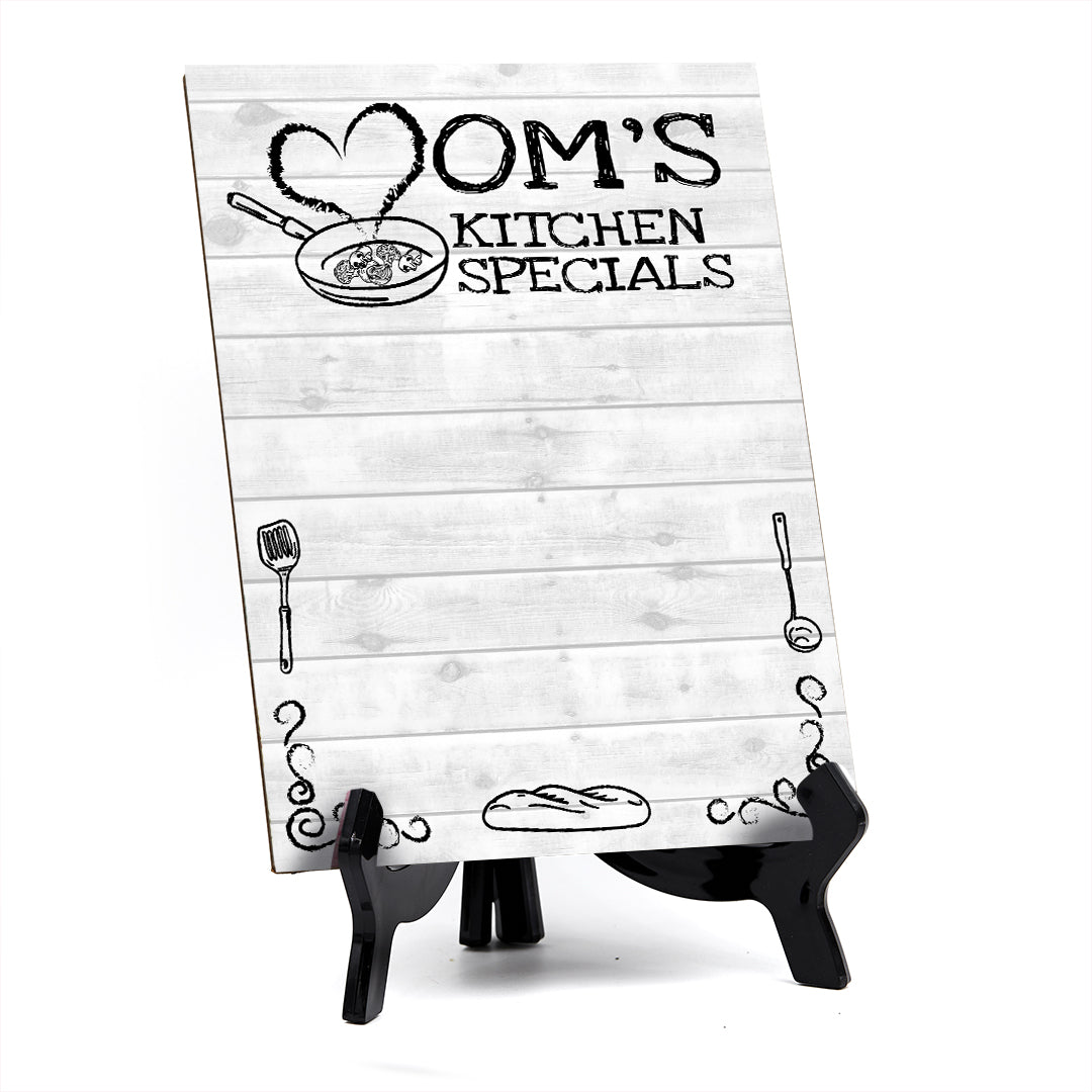 Mom's Kitchen Specials, Dry Wipe, Decorative Table Sign. This table sign comes with it's own black acrylic easel, easy to set up and display on any flat surface, eco-friendly signs with easy-to-clean surface.