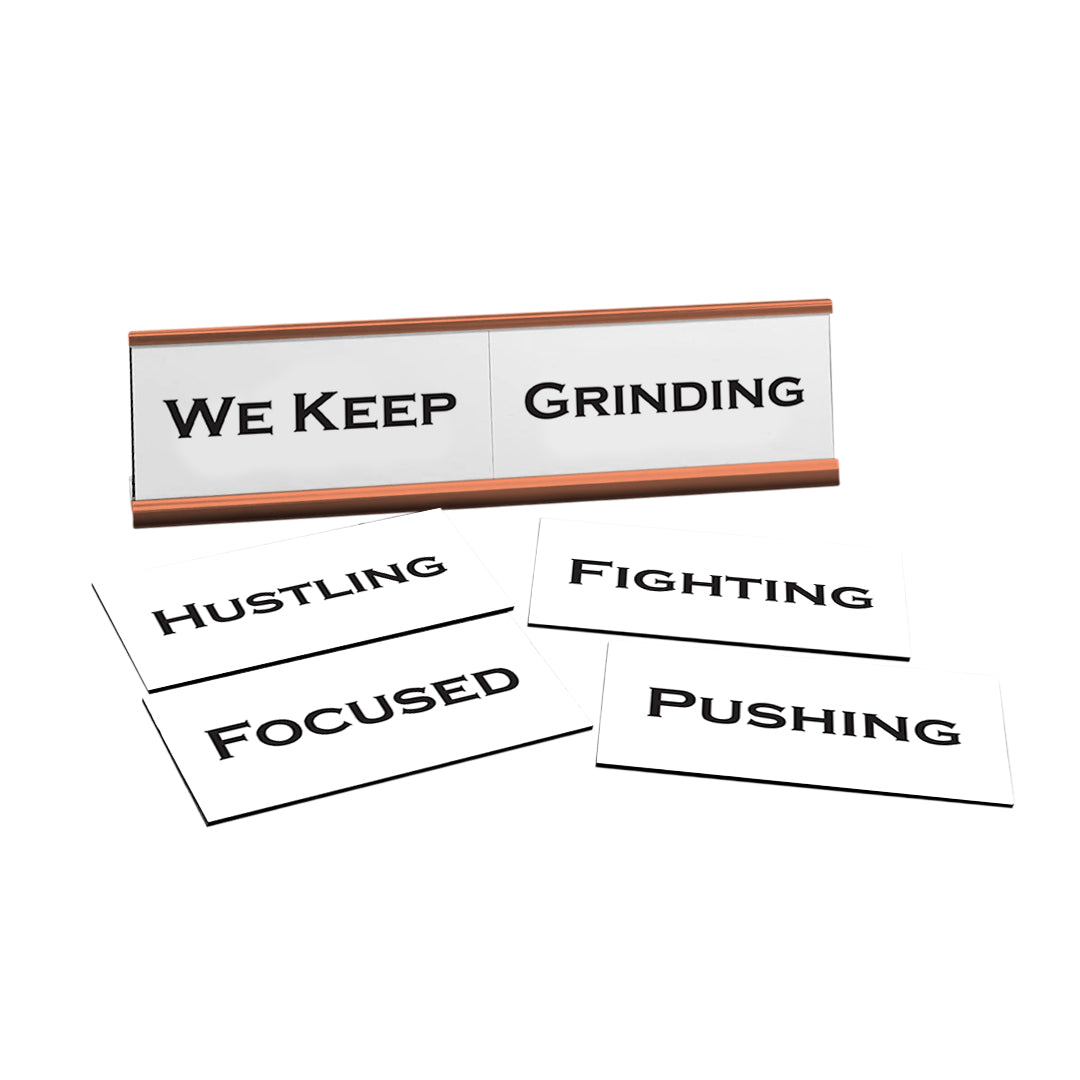 Motivational We Keep Working Word Play Nameplate, Rose Gold Desk Sign, Novelty Gift Nameplate, 6 Interchangeable Tiles (2 x 8")