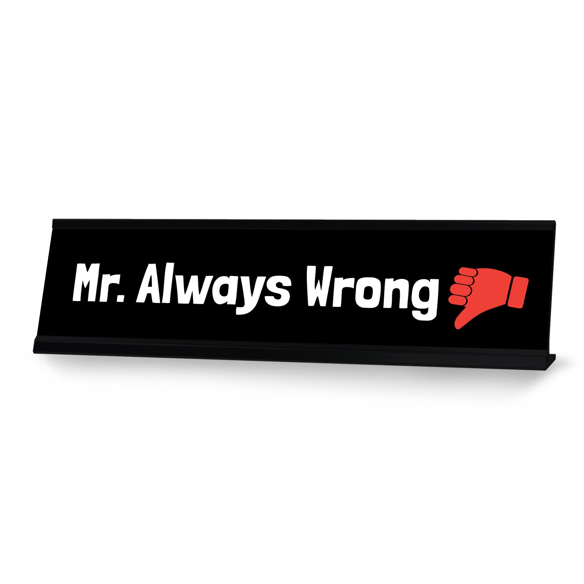 Signs ByLITA Novelty Desk Sign Nameplate "Mr. Always Wrong". Fun novelty desk sign gift idea for friends, family colleagues, bosses, managers and more. The premium sublimated plastic nameplate comes with a sturdy colored aluminium frame. Great office or desk sign for letting them know the Mr. always wrong.