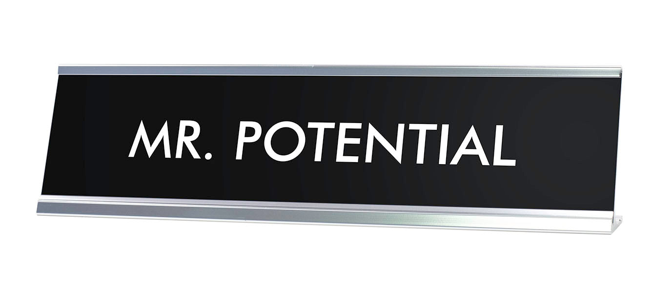 Novelty Desk Plate sign for the at home or work. The name plate is black with white lettering. Plate slides into a silver aluminum desk holder.