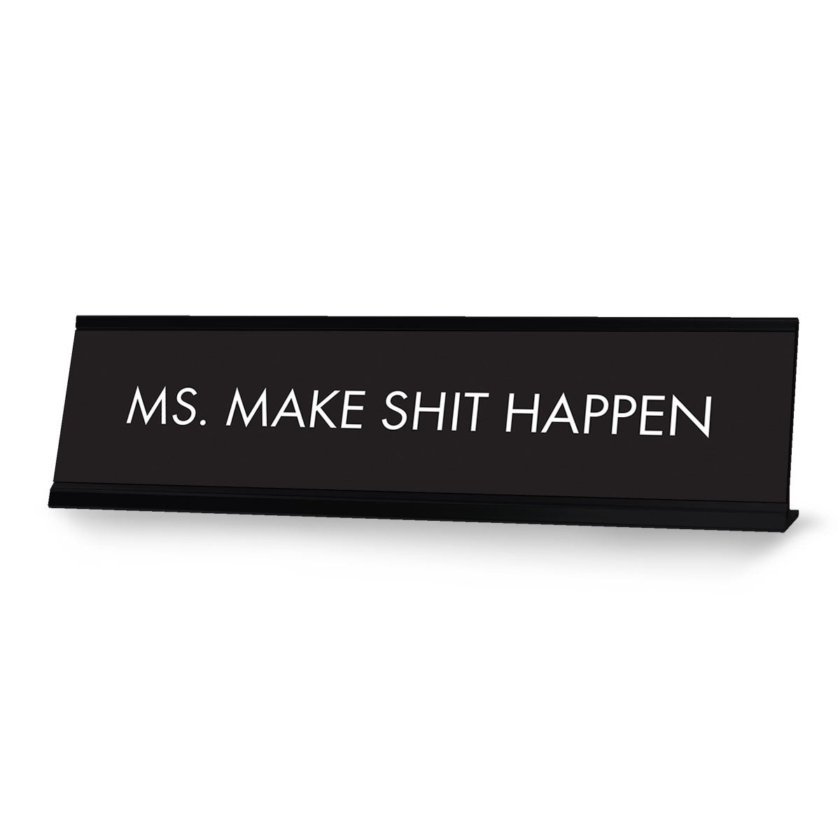 Designs ByLITA Novelty Desk Sign "Ms. Make Shit Happen Black". Our novelty desk signs are great gift ideas for colleagues, work partners, managers, friends, family or for yourself. Easy to set-up in your office, on your desk, shelf or window ledge. Our nameplates are made out of premium lazer engraved plastic, fitting into a sturdy aluminum frame.