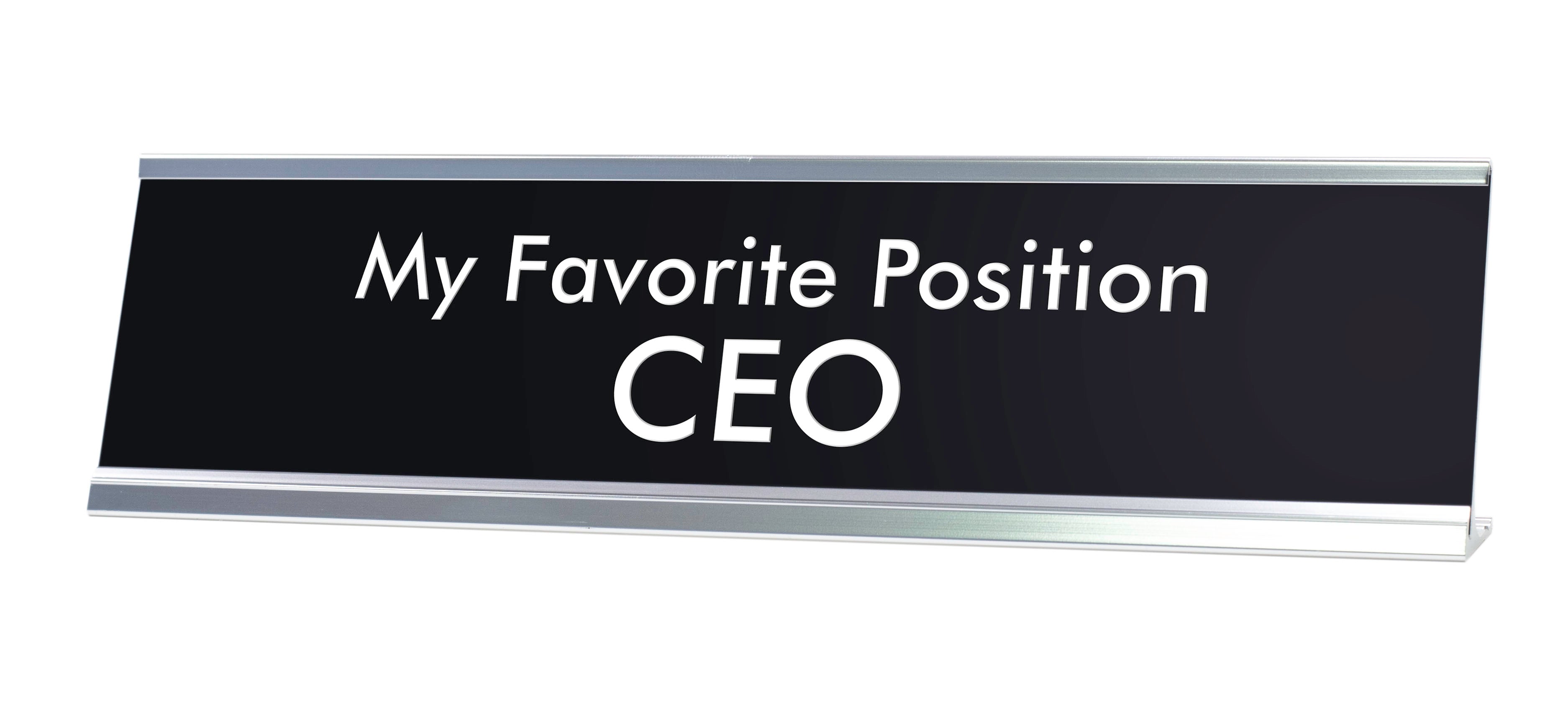 Novelty Desk Plate sign for the at home or work. The name plate is black with white lettering. Plate slides into a silver aluminum desk holder.