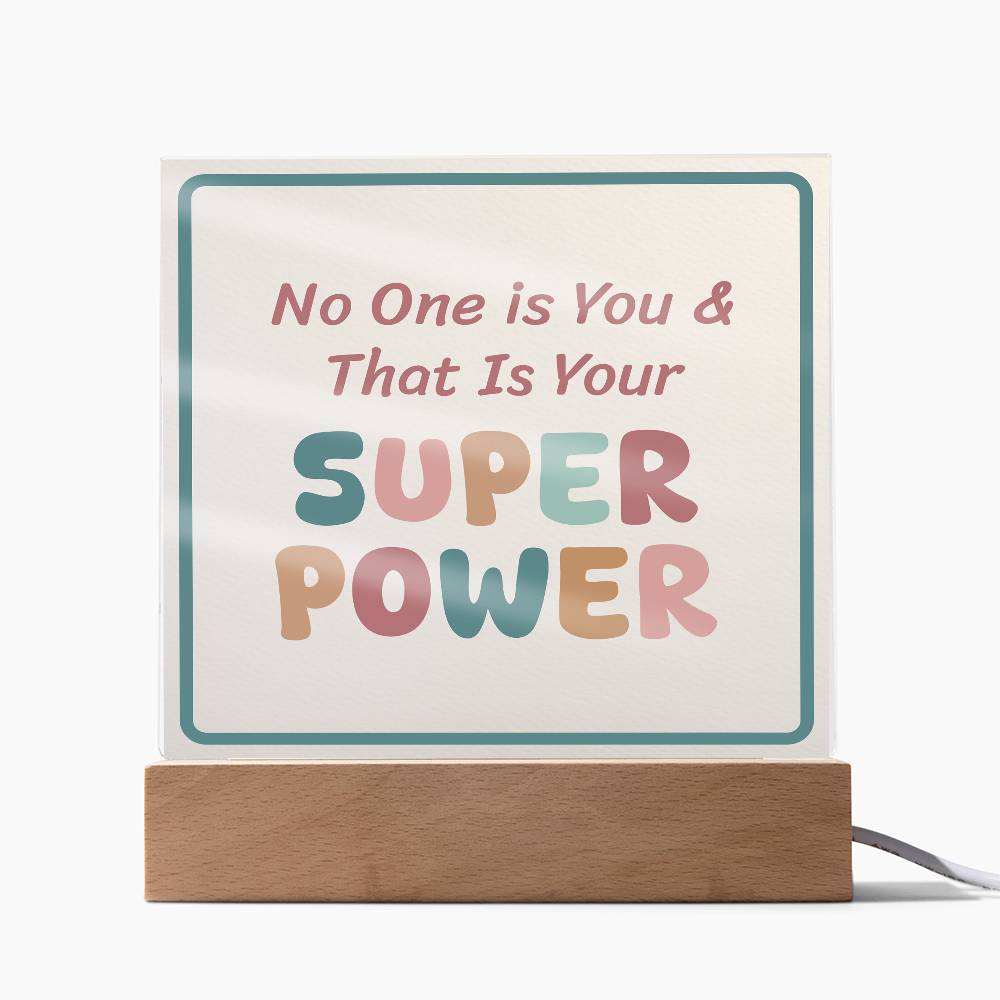 Create a memorable welcome to any room with our No One is You & That Is Your Super Power, Printed Square Acrylic Plaque. This beautiful sign is handcrafted using premium acrylic and a vibrantly printed design. Display your beautiful plaque in your own home or give it as a gift to make a statement. This would make an ideal gift for your beloved partner, family members, or dear friends on special occasions like anniversaries, birthdays, or any event where you want to express your love and appreciation in an unforgettable way.