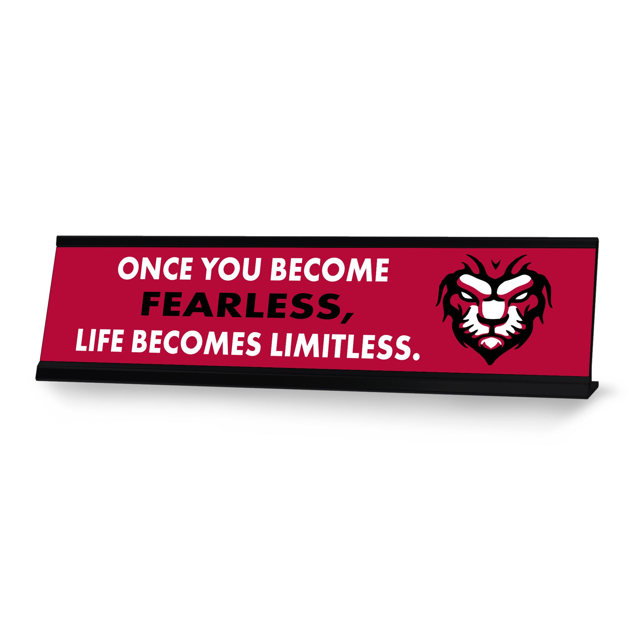 Novelty Desk Sign Nameplate "Once You Become Fearless, Life Becomes Limitless". Fun novelty desk sign gift idea for friends, family colleagues, bosses, managers and more. The premium sublimated plastic nameplate comes with a sturdy colored aluminium frame. Great office or desk sign for letting them know if you are fearless life is limitless.