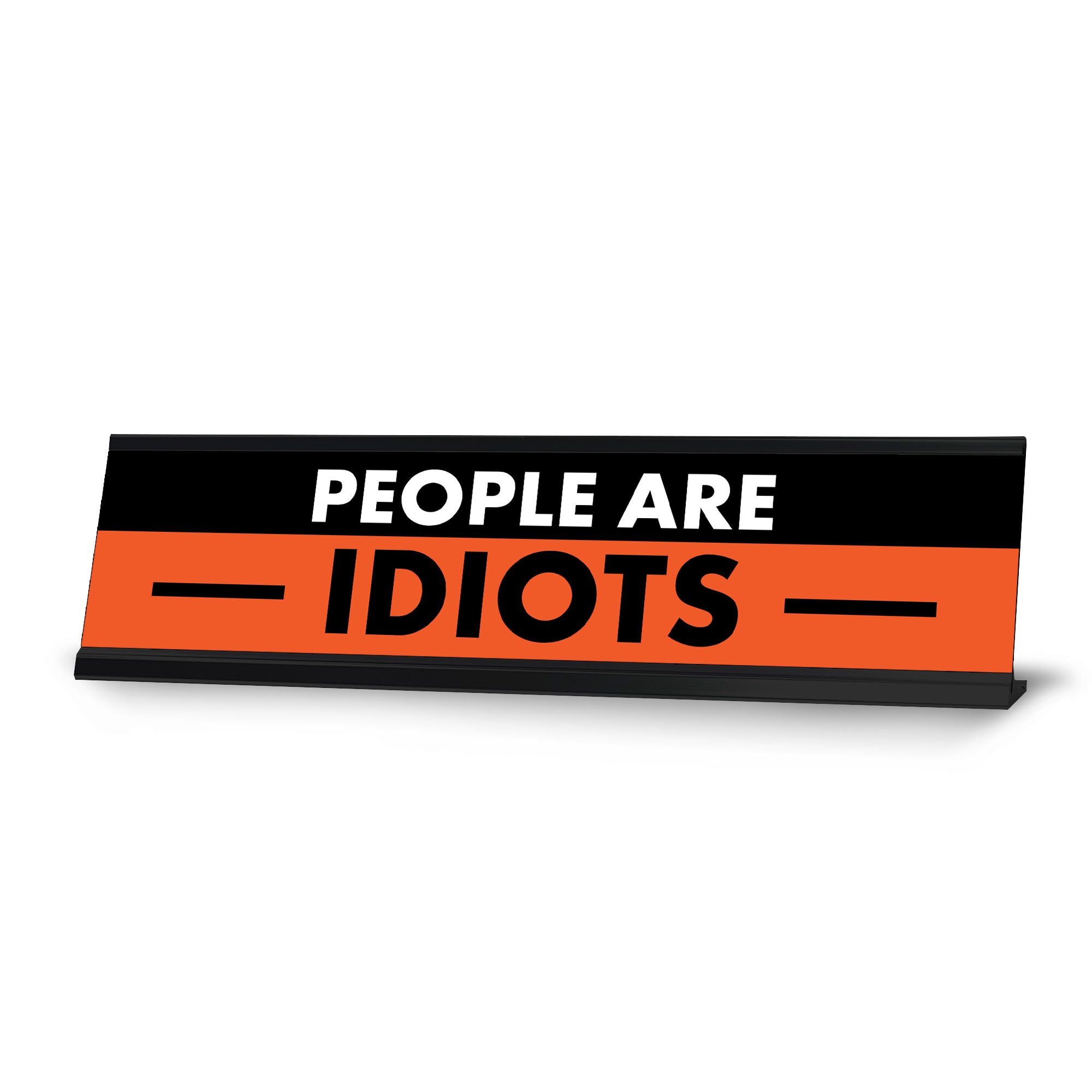 Novelty Desk Sign Nameplate "People are Idiots Black and Orange". Fun novelty desk sign gift idea for friends, family colleagues, bosses, managers and more. The premium sublimated plastic nameplate comes with a sturdy colored alumium frame. Great office gift desk sign.