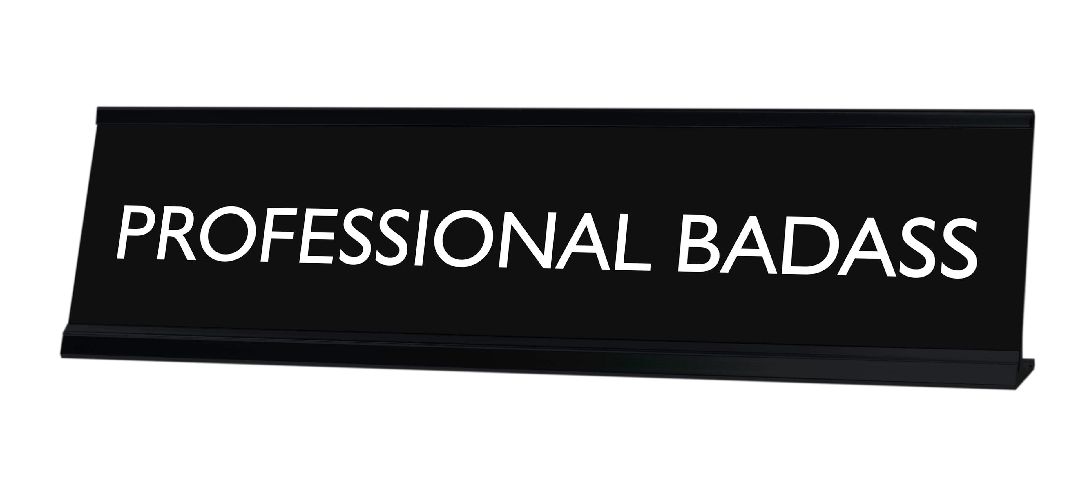 Novelty Desk Plate sign for the at home or work. The name plate is black with white lettering. Plate slides into a silver aluminum desk holder.
