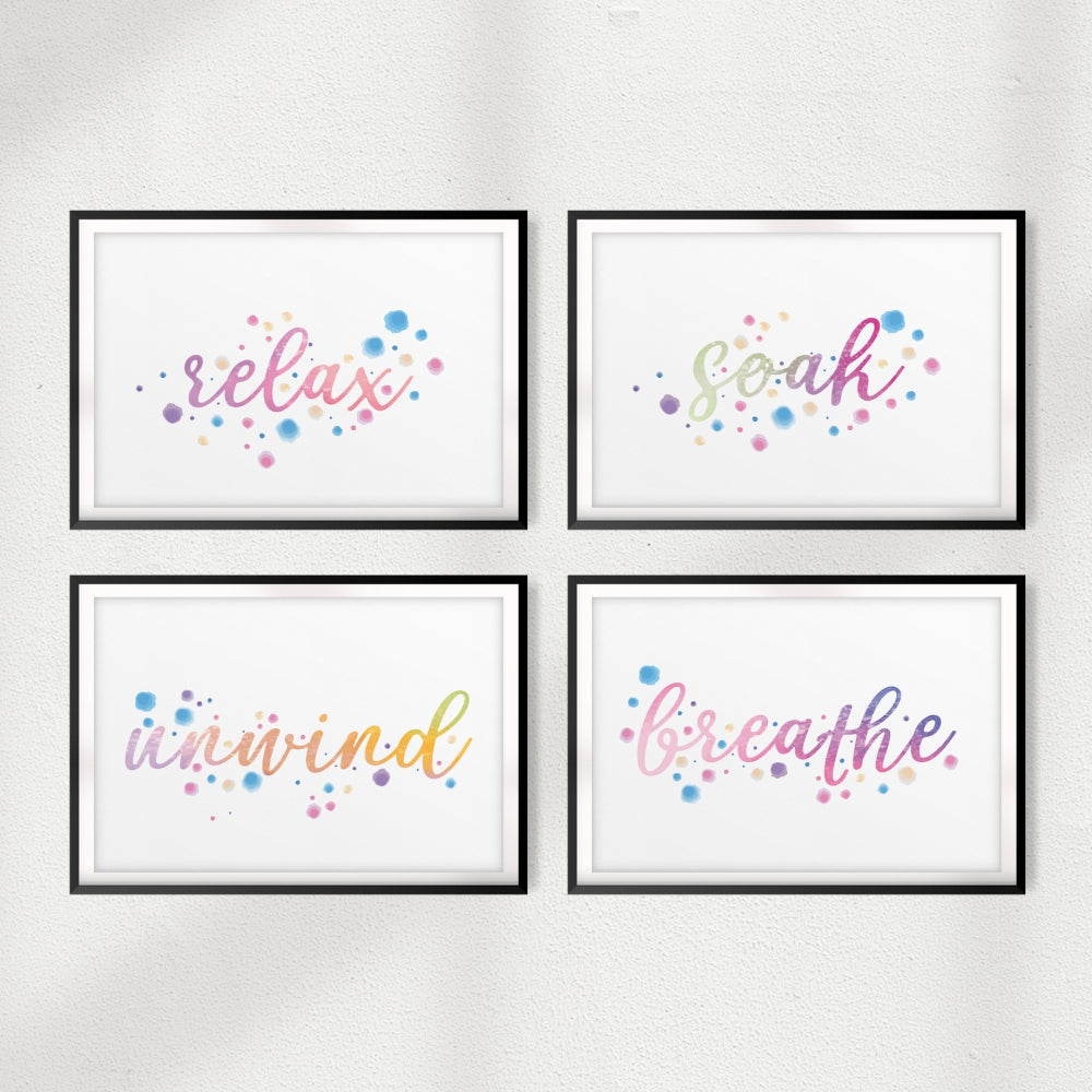 Relax, Soak, Unwind, Breathe (Pack of 4) UNFRAMED Print Home Décor, Quote Wall Art