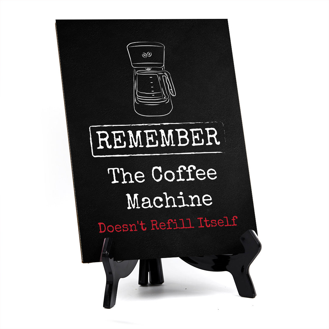 Remember The Coffee Machine Doesn't Refill Itself, 6X8 Table Sign. This table sign comes with it's own black acrylic easel, easy to set up and display on any flat surface. Brighten up your workspace with our Inspirational Funny Table sign. This delightful 6 x 8" sign is designed to add a touch of humor and motivation to any office or workplace environment. Made with high-quality materials and featuring a sleek black easel stand, this sign is both durable and stylish. Whether you place it on your desk, shelf, or any flat surface, it's sure to catch the eye and spark conversation. Inject some positivity into your day with our collection of witty and inspiring quotes that are sure to lift your spirits and bring a smile to your face. Perfect for yourself or as a gift for coworkers, friends, or family members, this table sign is a charming addition to any workspace.