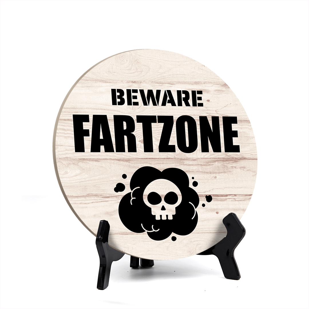 Round Beware Fart Zone, Decorative Bathroom Table Sign. This table sign comes with it's own black acrylic easel, easy to set up and display on any flat surface (5" x 5").