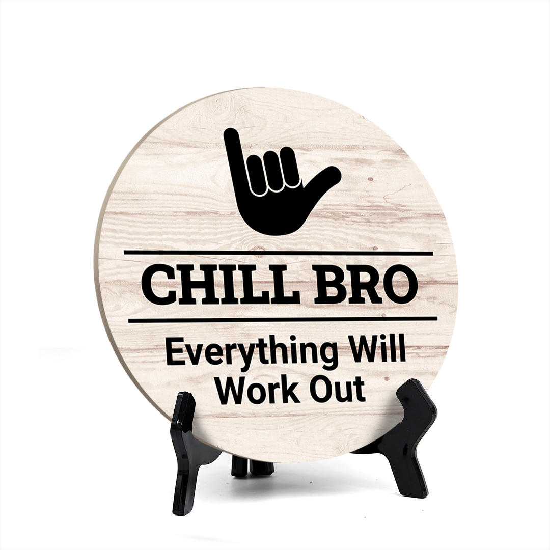 Round Chill Bro, Everything Will Work Out, Decorative Bathroom Table Sign. This table sign comes with it's own black acrylic easel, easy to set up and display on any flat surface.