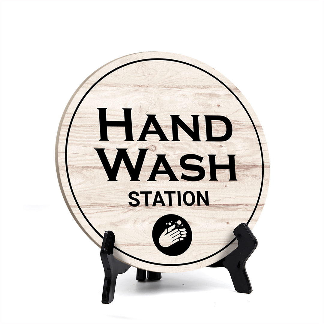 Round Hand Wash Station, Decorative Bathroom Table Sign. This table sign comes with it's own black acrylic easel, easy to set up and display on any flat surface.