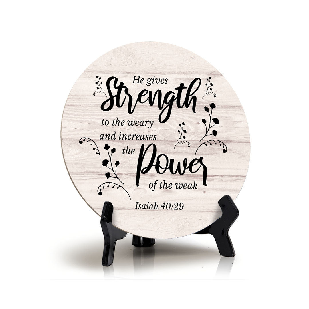 Round He Gives Strength To The Weary And Increases The Power Of The Weak. Isaiah 40:29, Decorative Bible Verses Table Sign. This table sign comes with it's own black acrylic easel, easy to set up and display on any flat surface.