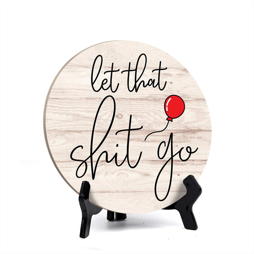 Round Let That Sh*t Go, Decorative Bathroom Table Sign. This table sign comes with it's own black acrylic easel, easy to set up and display on any flat surface.