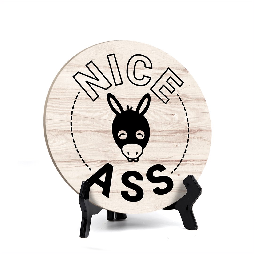 Round Nice Ass, Decorative Bathroom Table Sign. This table sign comes with it's own black acrylic easel, easy to set up and display on any flat surface (5" x 5").