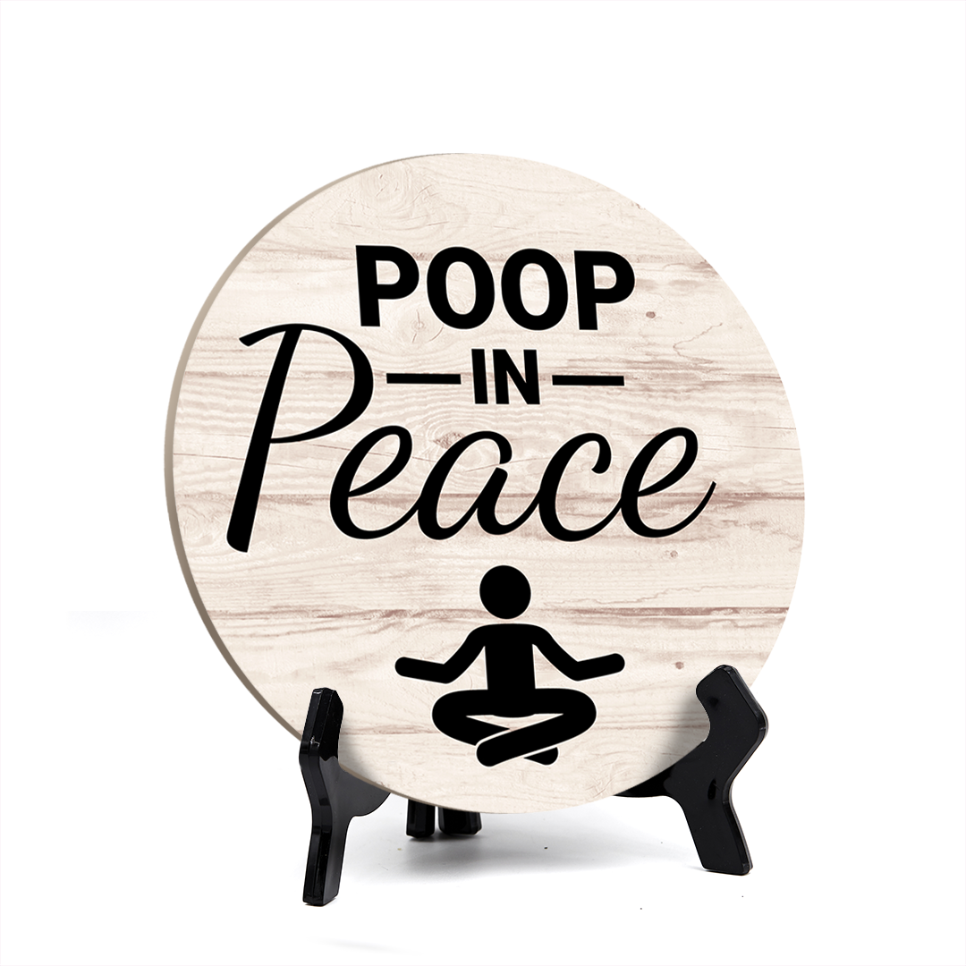 Round Poop In Peace, Decorative Bathroom Table Sign. This table sign comes with it's own black acrylic easel, easy to set up and display on any flat surface.