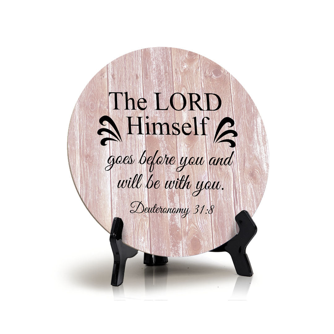 Round The Lord Himself Goes Before You And Will Be With You. Deuteronomy 31:8, Decorative Bible Verses Table Sign. This table sign comes with it's own black acrylic easel, easy to set up and display on any flat surface.