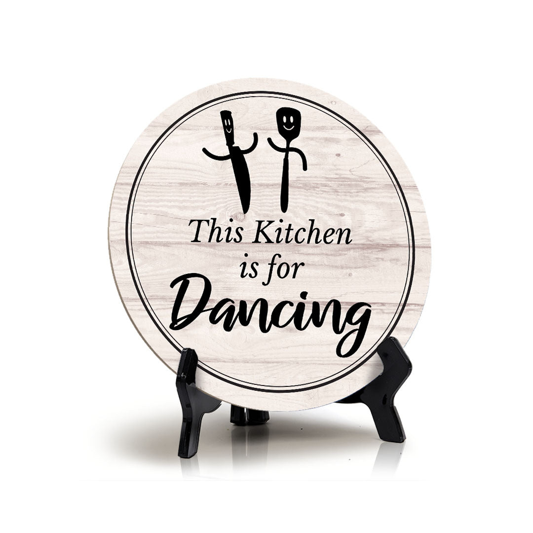 Round This Kitchen Is For Dancing, Decorative Kitchen Table Sign. This table sign comes with it's own black acrylic easel, easy to set up and display on any flat surface. This sign is 5" x 5" in size with a 4.5" black easel. The sign is a nice small size a fits great in a variety of places.