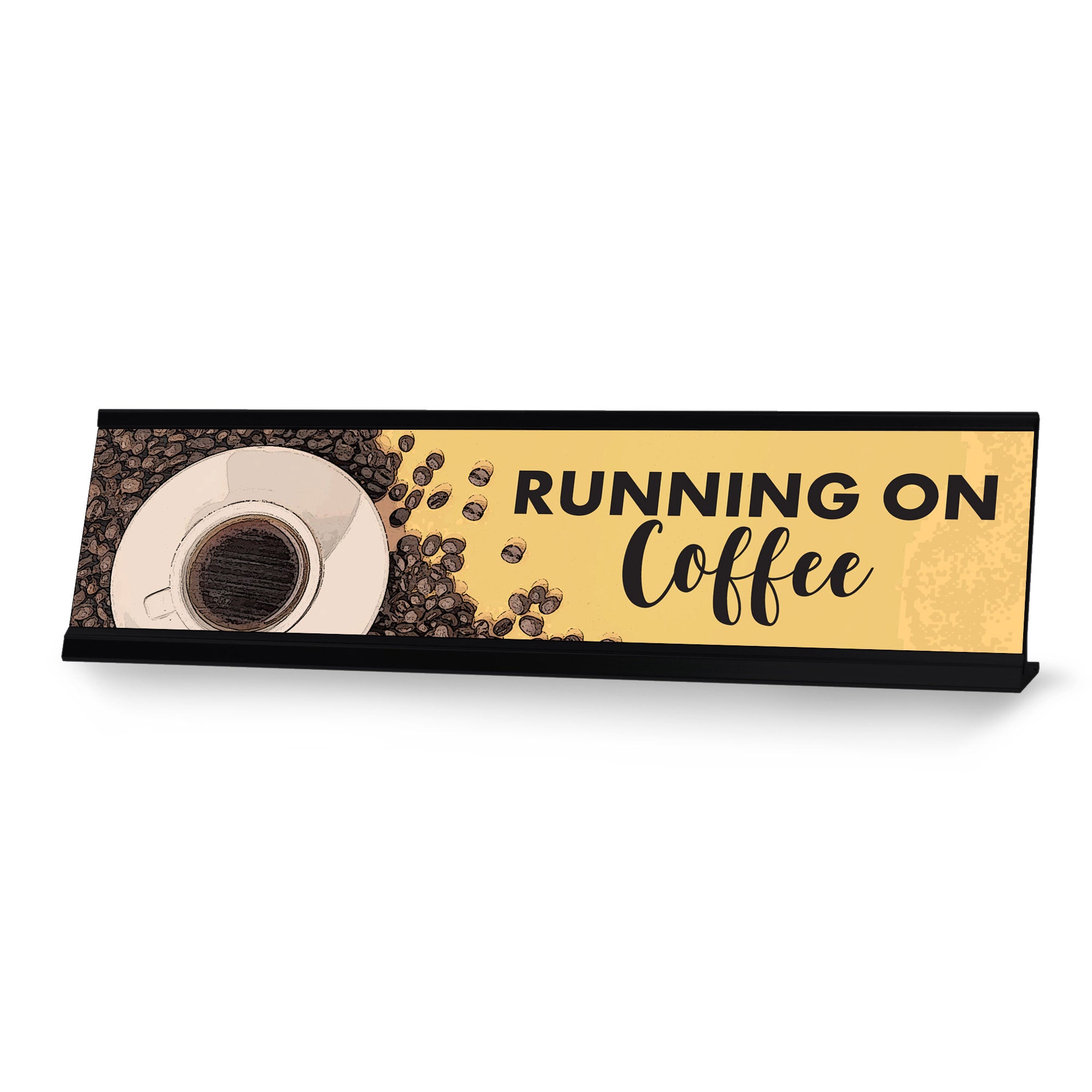 Signs ByLITA Novelty Desk Sign "Running on Coffee". Fun Novelty Gift Idea for Friends, Colleagues, Bosses, Managers and More. Our novelty nameplates are made out of premium sublimated plastic. Each desk plate comes with it's own aluminium desk frame. The plate easily slides into the frame, and is easily interchanged with another name plate. These fun desk signs are a great addition to your desk in your office, home or home office.