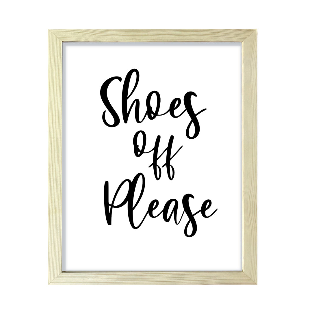 Shoes Off Please FRAMED PRINT. Our wall art is available either as a 5" x 7", 8" x 10" or 11" x 14". Printed on 160 GSM high quality card. Comes with a choice of Black, Light Brown or White colored frames. Easy to hang on any wall. This art is great for your home, office, workspace, bathroom or kitchen decor. Great friendly sign for asking for guests and visitors to take their shoes off.