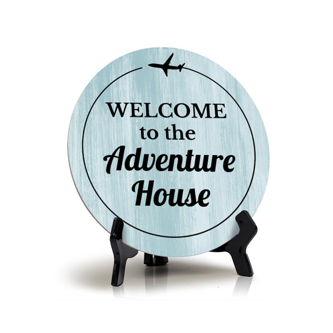 Circle Welcome to the Adventure House, Wood Color, Table Sign. This table sign comes with it's own black acrylic easel, easy to set up and display on any flat surface.