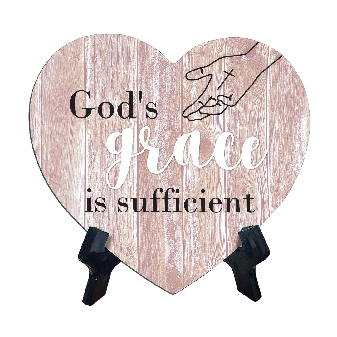 God's grace is sufficient, Wood Color, Heart Table Sign. This table sign comes with it's own black acrylic easel, easy to set up and display on any flat surface.