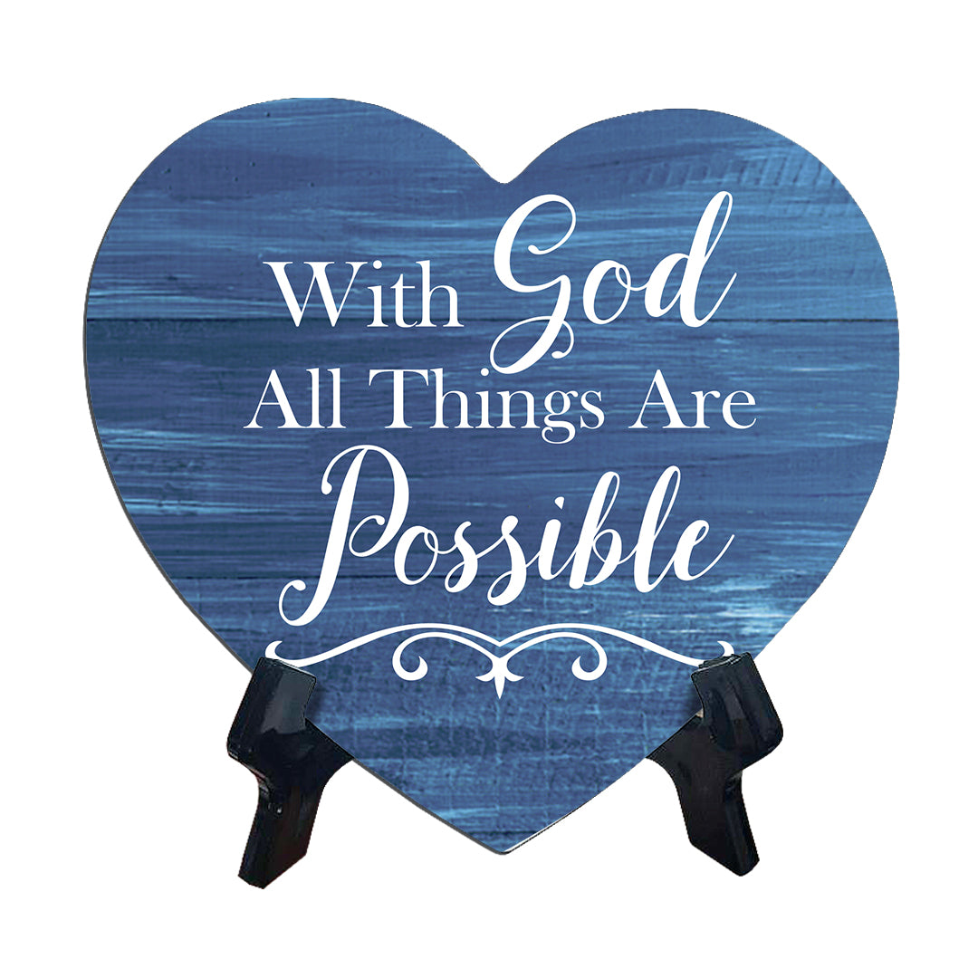 With God All Things Are Possible, Wood Color, Heart Table Sign. This table sign comes with it's own black acrylic easel, easy to set up and display on any flat surface.