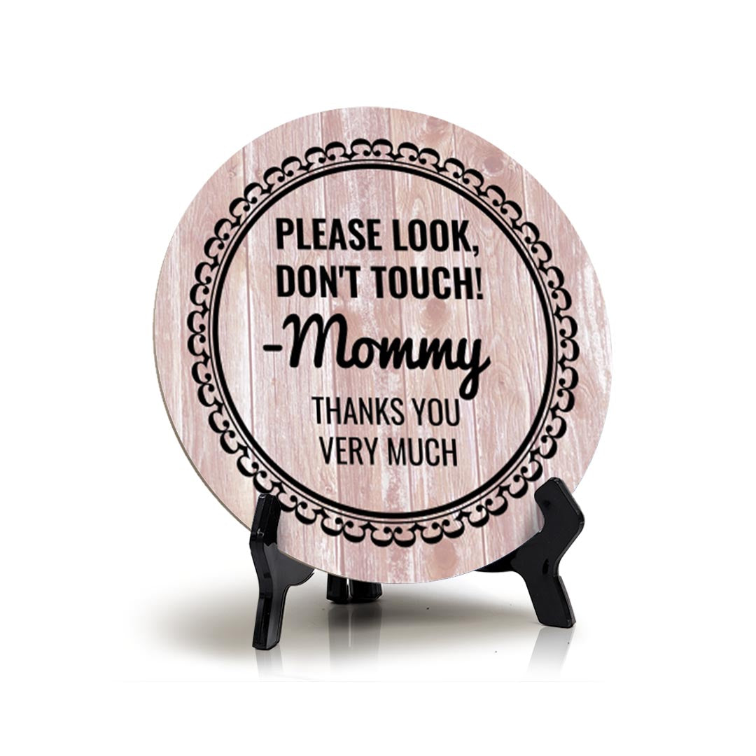Please Look, Don't Touch! -Mommy Thanks you very much! Round Table Sign. This table sign comes with it's own black acrylic easel, easy to set up and display on any flat surface.