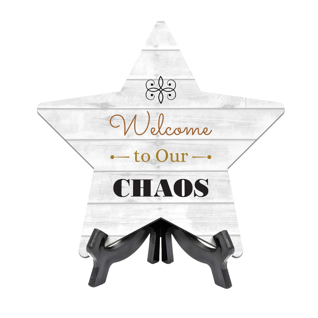 Welcome to Our Chaos, Wood Color, Star Table Sign. This table sign comes with it's own black acrylic easel, easy to set up and display on any flat surface.
