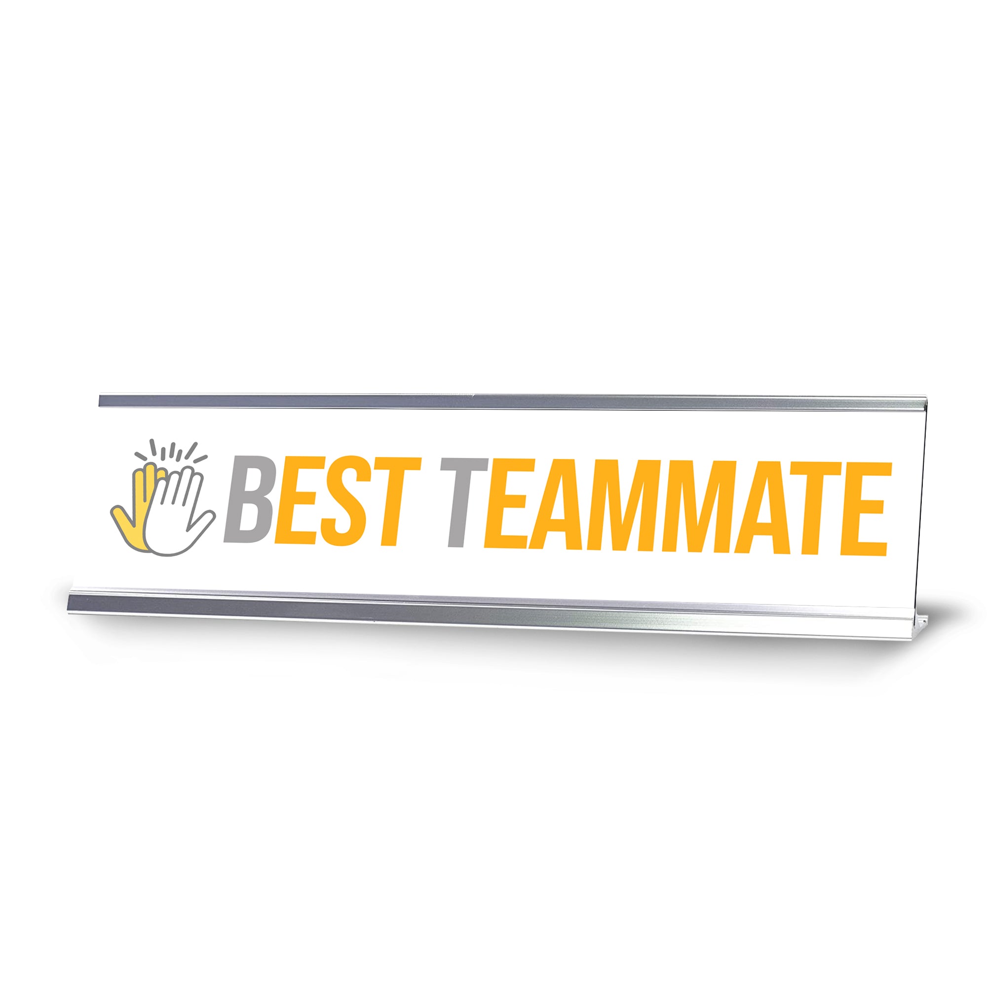 Signs ByLITA Novelty Desk Sign Nameplate "Best Teammate". Fun novelty desk sign gift idea for friends, family colleagues, bosses, managers and more. The premium sublimated plastic nameplate comes with a sturdy colored aluminium frame. Great office or desk sign for letting them know the best teammate.