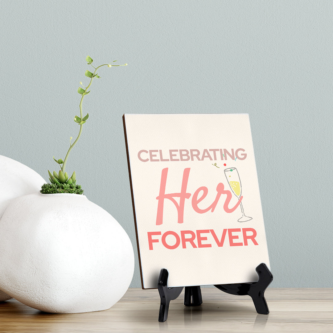 Celebrating Her Forever, Decorative Table Sign. This table sign comes with it's own black acrylic easel, easy to set up and display on any flat surface.