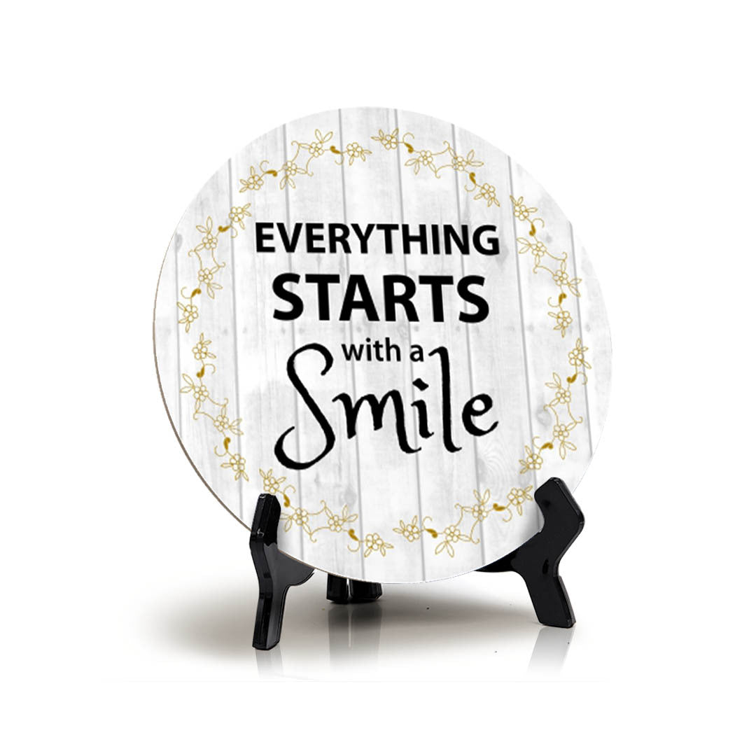 Circle Everything Starts With a Smile, Wood Color, Table Sign. This table sign comes with it's own black acrylic easel, easy to set up and display on any flat surface.