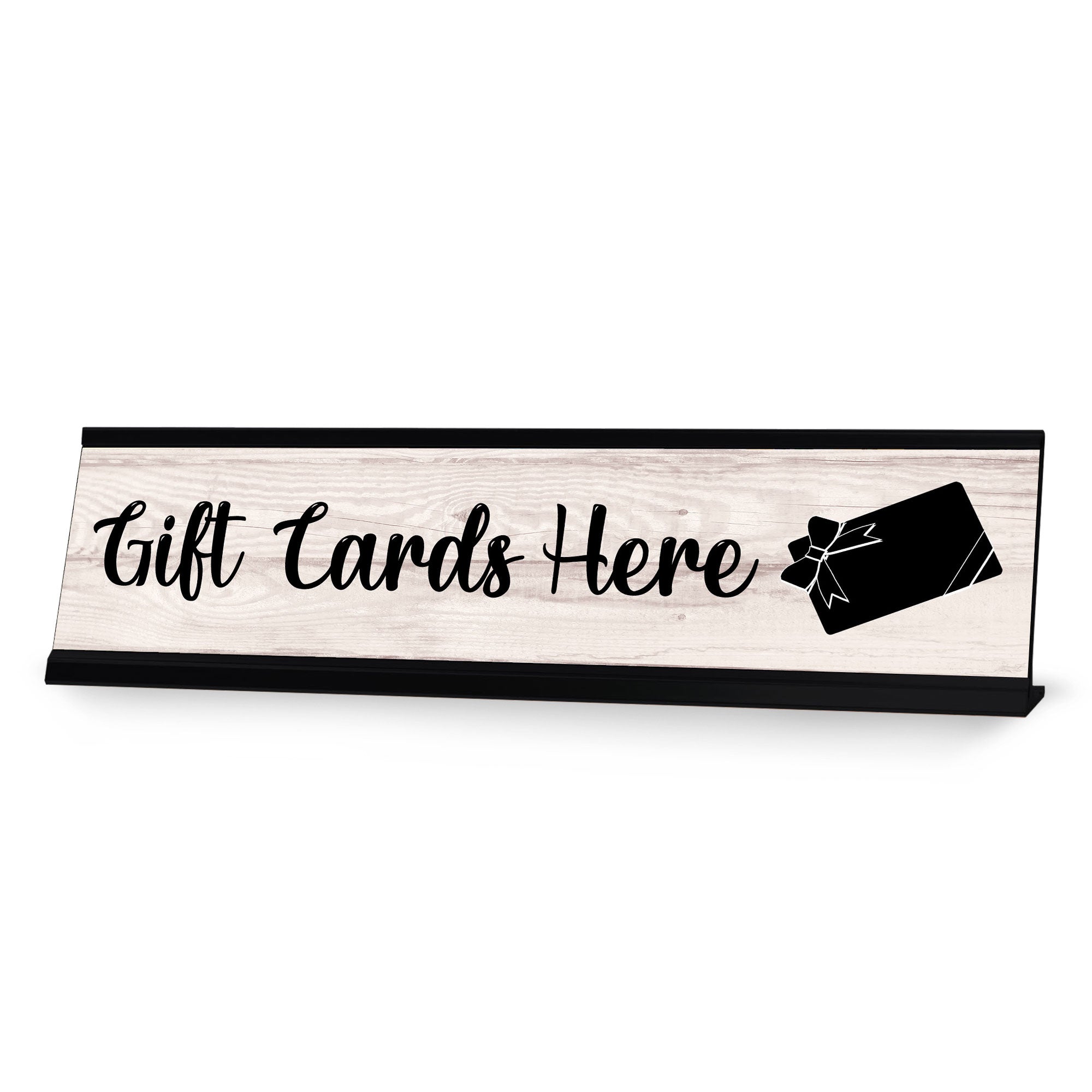 Signs ByLITA Novelty Desk Sign Nameplate "Gift Cards Here". Fun novelty desk sign gift idea for friends, family colleagues, bosses, managers and more. The premium sublimated plastic nameplate comes with a sturdy colored aluminium frame. Great office or desk sign for letting them know the gift cards.