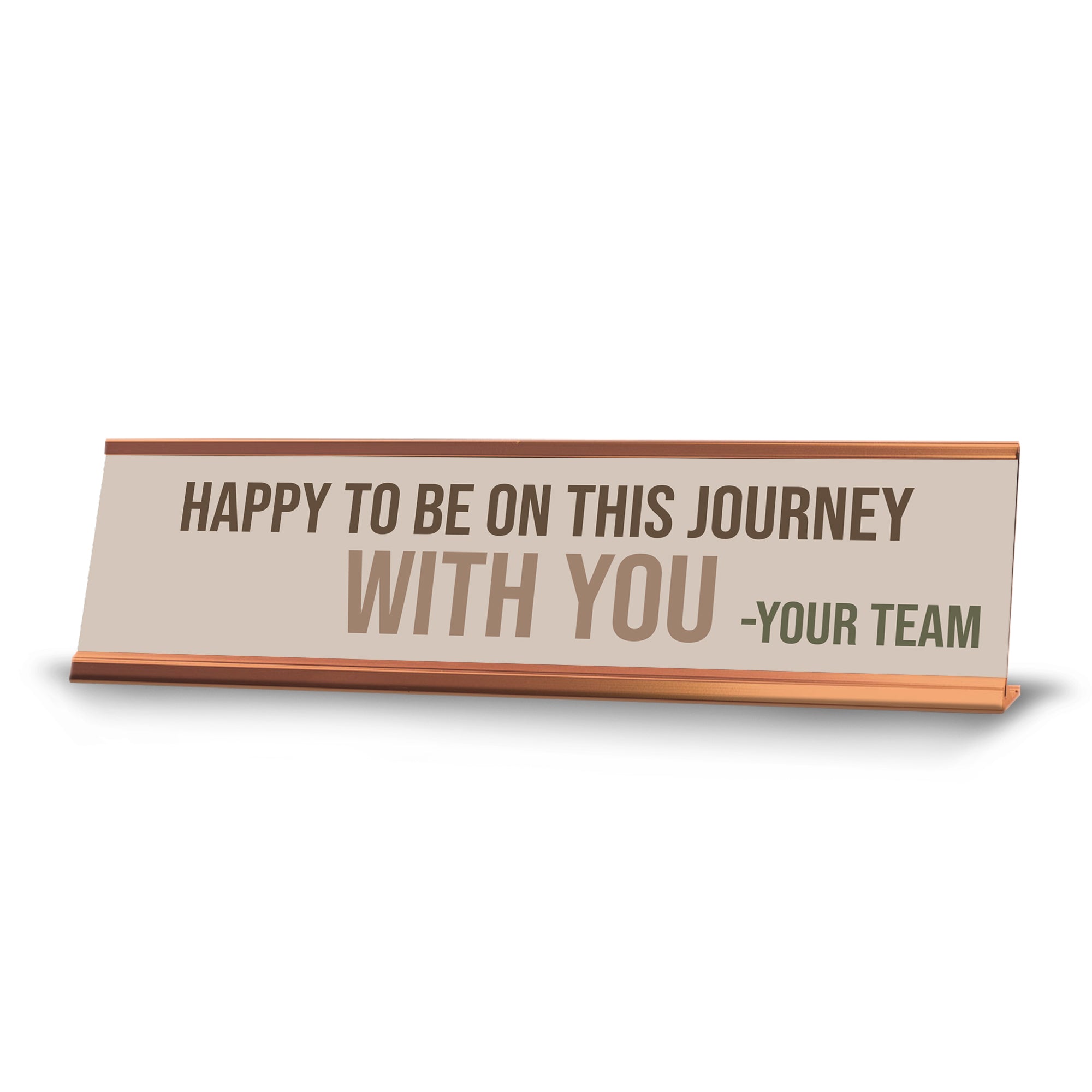 Signs ByLITA Novelty Desk Sign Nameplate "Happy To Be On This Journey With You. Your Team". Fun novelty desk sign gift idea for friends, family colleagues, bosses, managers and more. The premium sublimated plastic nameplate comes with a sturdy colored aluminium frame. Great office or desk sign for letting them know them know that you're happy with the team.