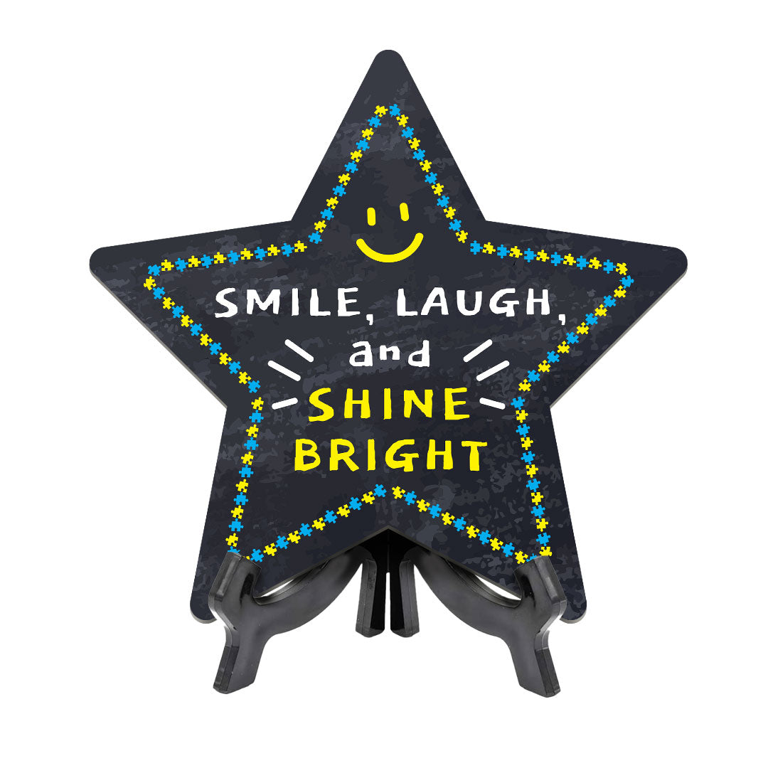Smile, Laugh, and Shine Bright, Star Table Sign. This table sign comes with it's own black acrylic easel, easy to set up and display on any flat surface.