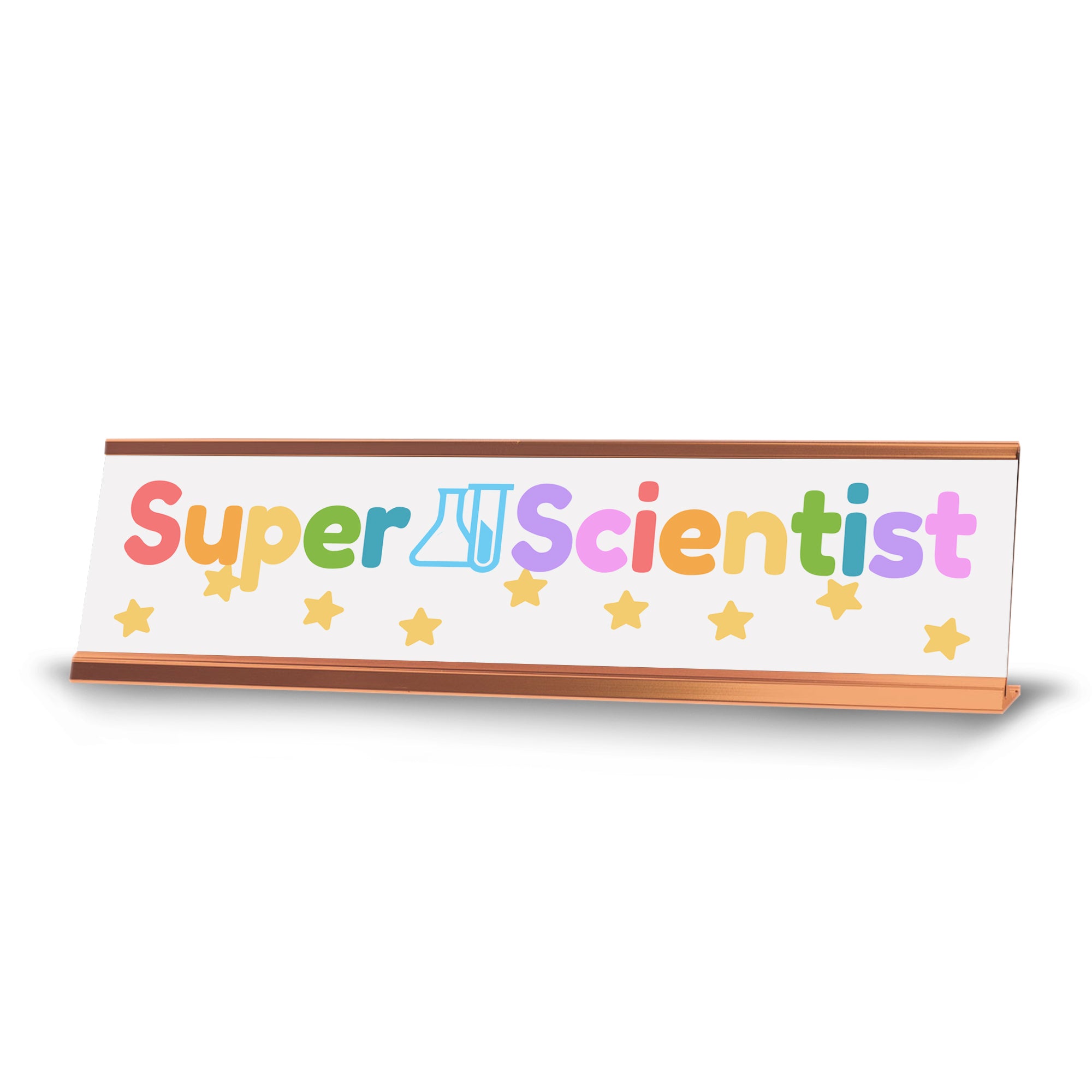 Signs ByLITA Novelty Desk Sign Nameplate "Super Scientist". Fun novelty desk sign gift idea for friends, family colleagues, bosses, managers and more. The premium sublimated plastic nameplate comes with a sturdy colored aluminium frame. Great office or desk sign for letting them know the super scientist.