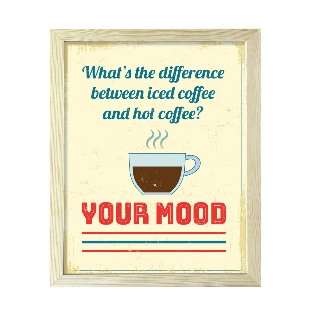 Signs ByLITA "What's the difference between iced coffee and hot coffee? Your Mood" UNFRAMED PRINT. Our wall art is available either as a 5" x 7", 8" x 10" or 11" x 14". Printed on 160 GSM high quality card. Comes as an UNFRAMED print. Easy to hang on any wall. This art is great for your home, office, workspace, for Air BnB properties/ hosts, and hospitality venues. Be sure to check out our other coffee bar designs!