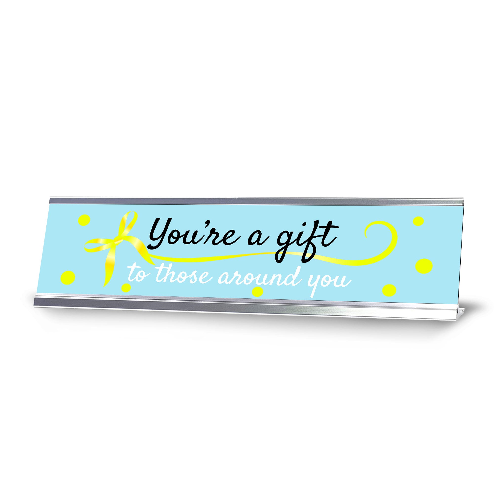 Signs ByLITA Novelty Desk Sign Nameplate "You're A Gift To Those Around You". Fun novelty desk sign gift idea for friends, family colleagues, bosses, managers and more. The premium sublimated plastic nameplate comes with a sturdy colored aluminium frame. Great office or desk sign for letting them know that you're a gift.