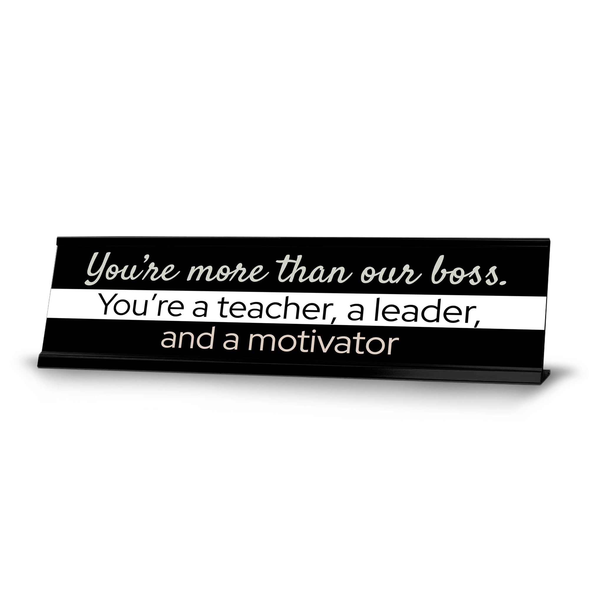 Signs ByLITA Novelty Desk Sign Nameplate "You?re More Than Our Boss. You?re a teacher, a Leader, and a Motivator". Fun novelty desk sign gift idea for friends, family colleagues, bosses, managers and more. The premium sublimated plastic nameplate comes with a sturdy colored aluminium frame. Great office or desk sign for letting them know that you're more than a boss.