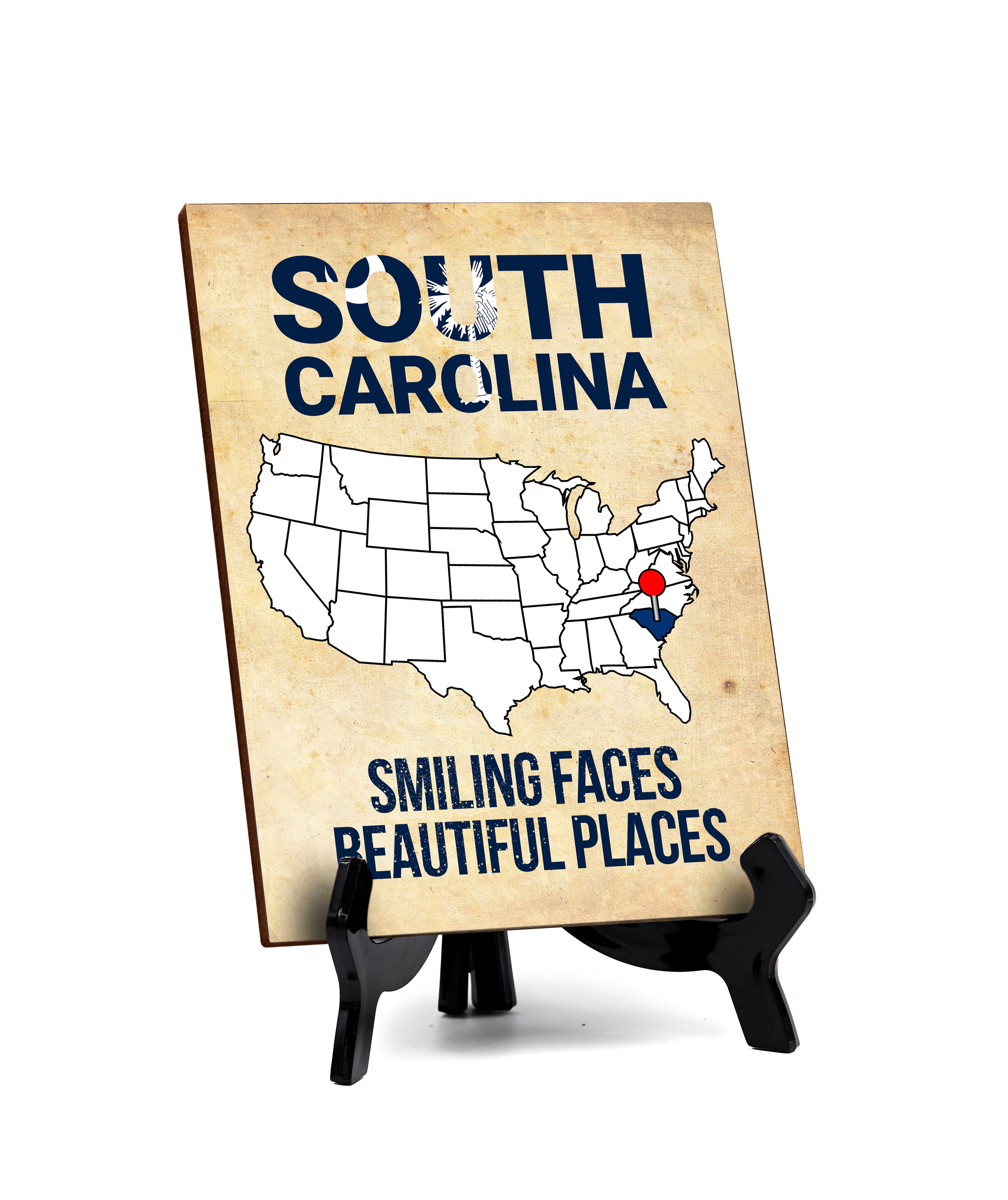 South Carolina: Smiling Faces, Beautiful Places, Decorative Table Sign. This table sign comes with it's own black acrylic easel, easy to set up and display on any flat surface.
