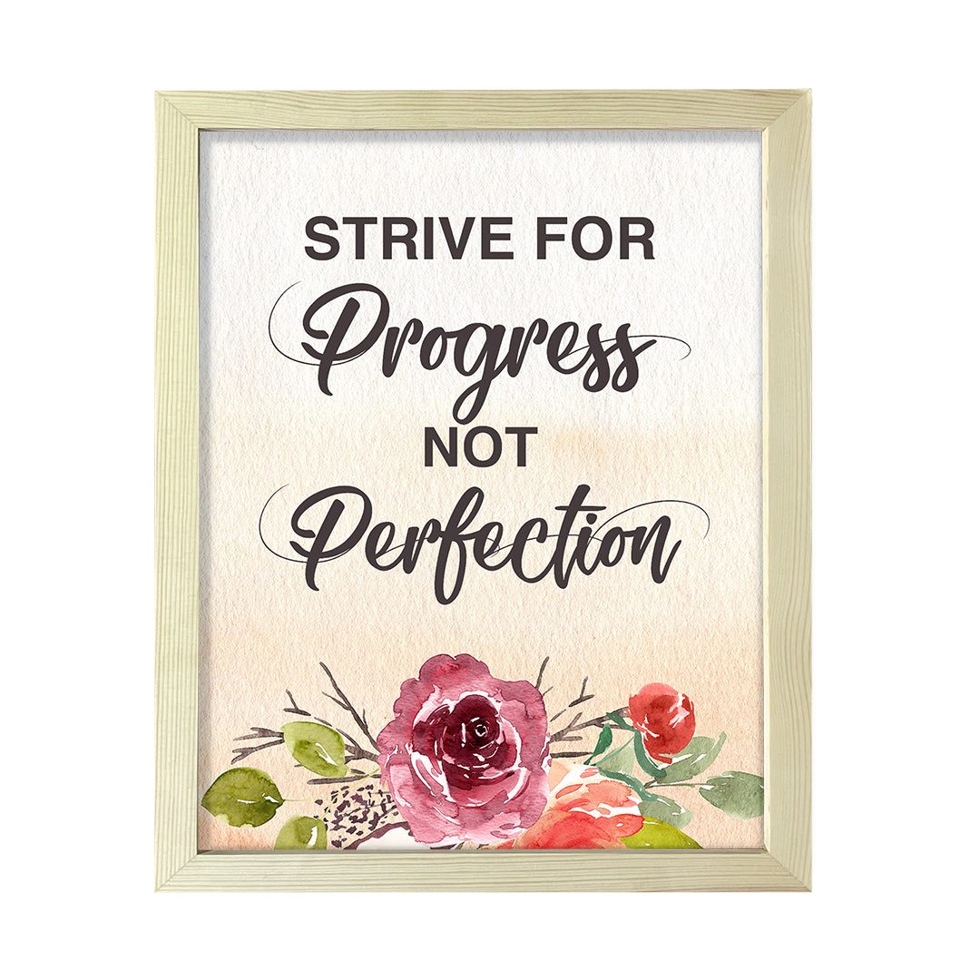 Strive for progress not perfection FRAMED PRINT. Our wall art is available either as a 5" x 7", 8" x 10" or 11" x 14". Printed on 160 GSM high quality card. Comes with a choice of Black, Light Brown or White colored frames. Easy to hang on any wall. This art is great for your home, office, workspace, bathroom or kitchen decor.