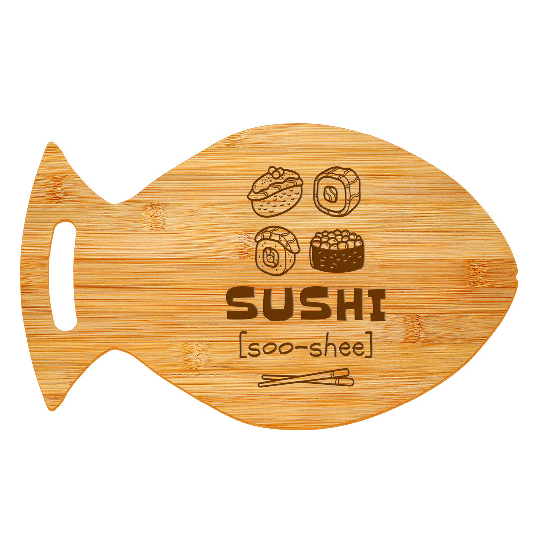 Transform your kitchen with our Engraved Bamboo Fish Shaped Cutting Board. Crafted from premium bamboo, this cutting board not only serves its functional purpose but also brings a touch of humor to your cooking space. The adorable fish shape and the engraved message, "Sushi (Soo-Shee)," make it a delightful addition to any kitchen. Made from sustainable bamboo, this cutting board is not only durable but also environmentally friendly. The smooth surface is gentle on your knives, ensuring they stay sharp, while the sturdy construction guarantees longevity. The versatile design allows you to use it not only as a cutting surface but also as a stylish serving platter. Cleaning is a breeze - simply hand wash with mild soap and water, and dry thoroughly to maintain its natural beauty. This cutting board is not just a kitchen tool; it's a conversation starter and a fantastic gift for housewarmings, birthdays, or any occasion where a touch of humor is welcomed. Upgrade your kitchen or delight a loved one with the charm of our Engraved Bamboo Fish Shaped Cutting Board - because cooking should always be a delightful experience!