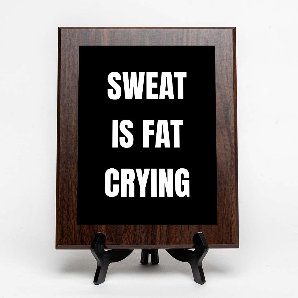 Elevate your space with our Sweat Is Fat Crying decorative wall plaque. Crafted with precision, each plaque features a solid Walnut finish wood base with a sleek aluminum plate, carrying a range of stylish and contemporary designs. Choose from three sizes - 7x5", 10x8", or 9x12" - and a stylish natural or black wood base. For easy installation, each plaque is equipped with pre-cut keyhole slots on the reverse side. Mount it securely on your wall or display it on a stylish acrylic easel for added versatility. Our commitment to quality extends to ensuring your plaque arrives in pristine condition. Each piece is carefully shrink-wrapped and protected with bubble wrap during transit, so you receive it exactly as envisioned. Transform your surroundings and make a lasting impression with these beautifully crafted pieces. It's more than decor; it's a reflection of your taste and a tribute to enduring elegance.