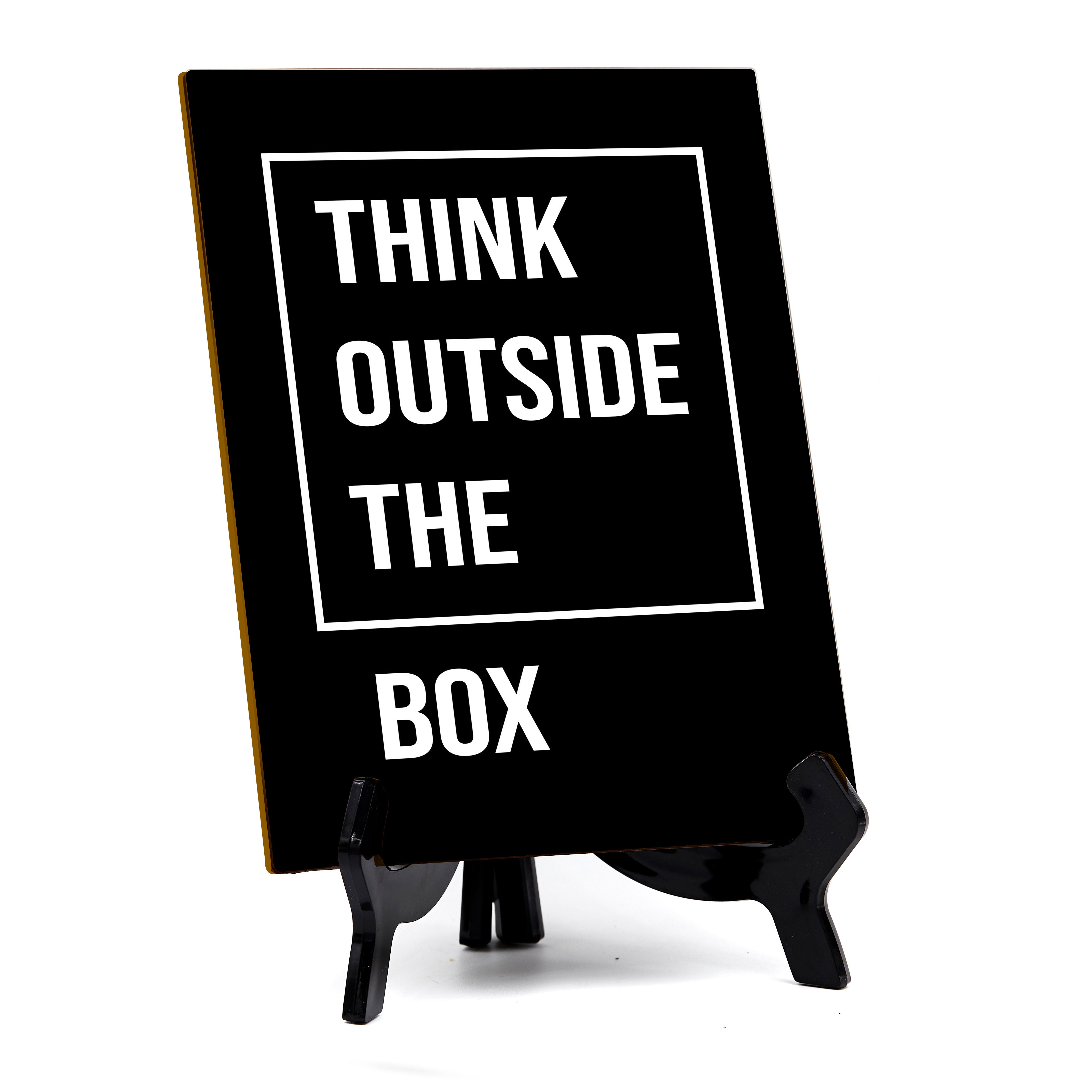 Think Outside The Box, 6X8 Table Sign. This table sign comes with it's own black acrylic easel, easy to set up and display on any flat surface. Elevate the ambiance of any space with our Motivational Table Sign, designed to inspire and uplift with its powerful messages. Measuring 6 x 8 inches, this sleek and stylish sign is the perfect addition to your desk, table, or shelf. Crafted from premium materials, it boasts durability and longevity, ensuring that its motivational quotes continue to inspire for years to come. Featuring an elegant black easel stand, this sign effortlessly blends in with any decor, adding a touch of sophistication to your surroundings. Whether placed in your home, office, classroom, or any other environment, its versatility shines through, offering a source of inspiration wherever it's needed. Setting up your motivational sign is a breeze thanks to the included easel stand, allowing for quick and easy display. Whether you're seeking a daily dose of encouragement for yourself or looking for the perfect gift for a friend, family member, or coworker, our Motivational Table Sign is sure to leave a lasting impression. Let positivity and motivation fill your space with this inspiring addition to your decor.