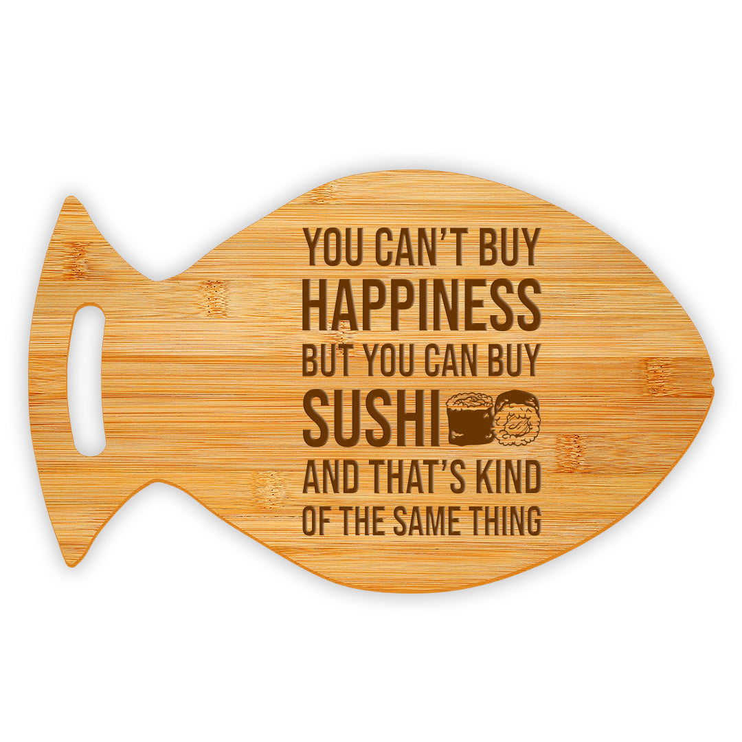 You Can't Buy Happiness But You Can Buy Sushi 14 x 8.5" Fish Shape Cutting Board | Decorative Kitchen Accessory For Sushi Lovers