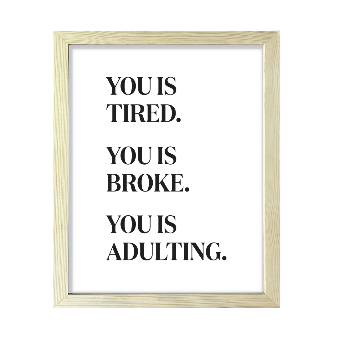 You is Tired. You is Broke. You is Adulting. FRAMED PRINT. Our wall art is available either as a 5" x 7", 8" x 10" or 11" x 14". Printed on 160 GSM high quality card. Comes with a choice of Black, Light Brown or White colored frames. Easy to hang on any wall. This art is great for your home, office, workspace, bathroom or kitchen decor.